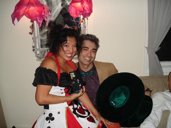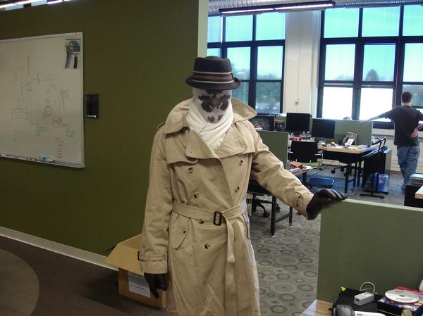 The amazing thing about artists is that they extend their own respective genius to all aspects of their lives. Our Art Director made this costume all by himself. The mask is made of duct tape, paper mache, wire hangers, and sunglass lenses. I was so impressed by this costume that I took a billion pictures of it! Also, it had me creeped out and jumping at shadows the whole weekend!