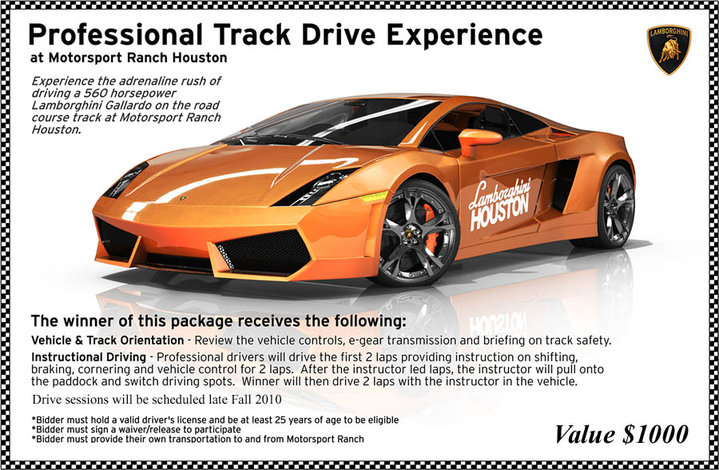 - Motorsport Ranch Houston – Drive Lamborghini Gallardo on a professional racetrack! ($1000 value)