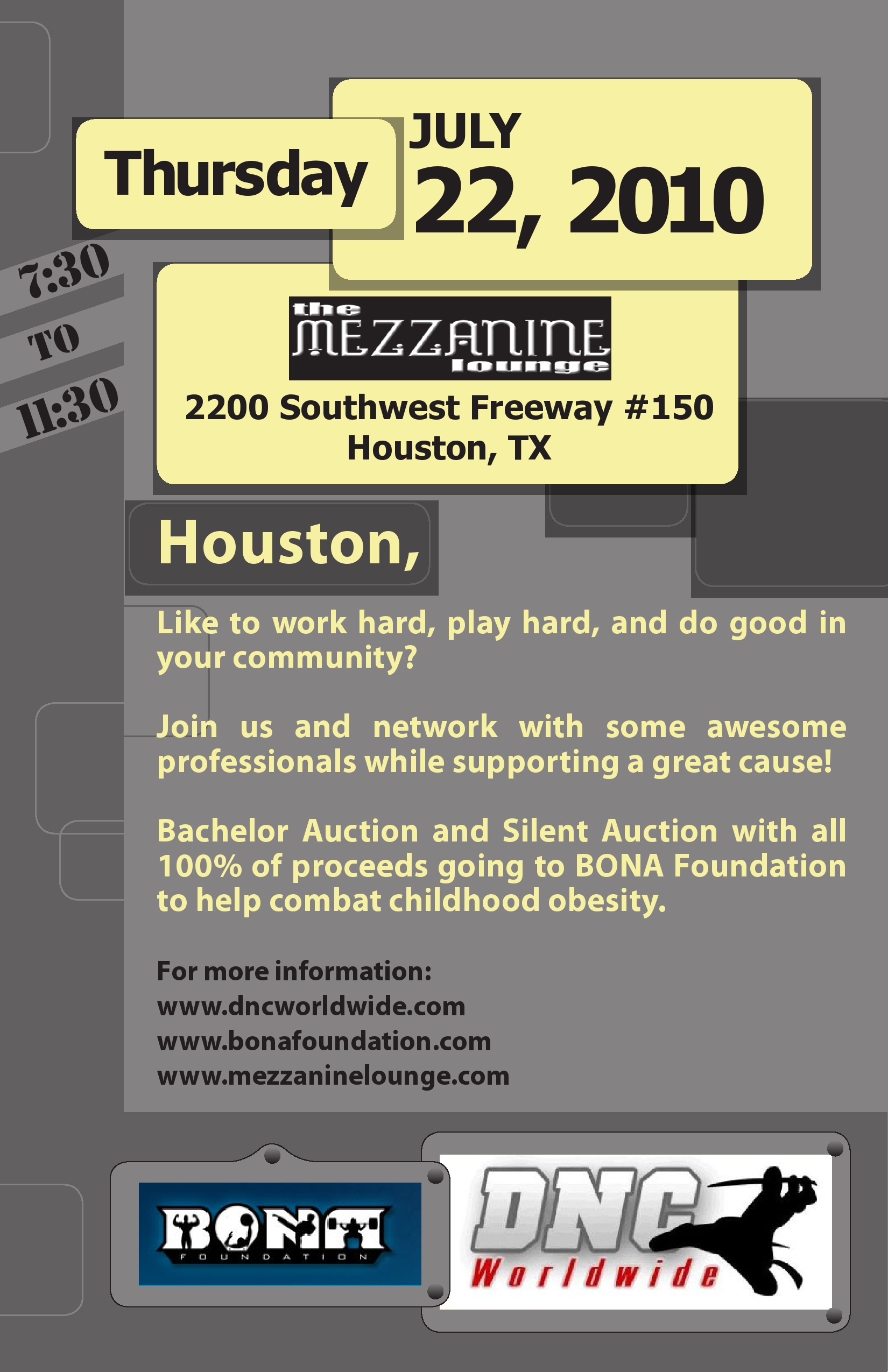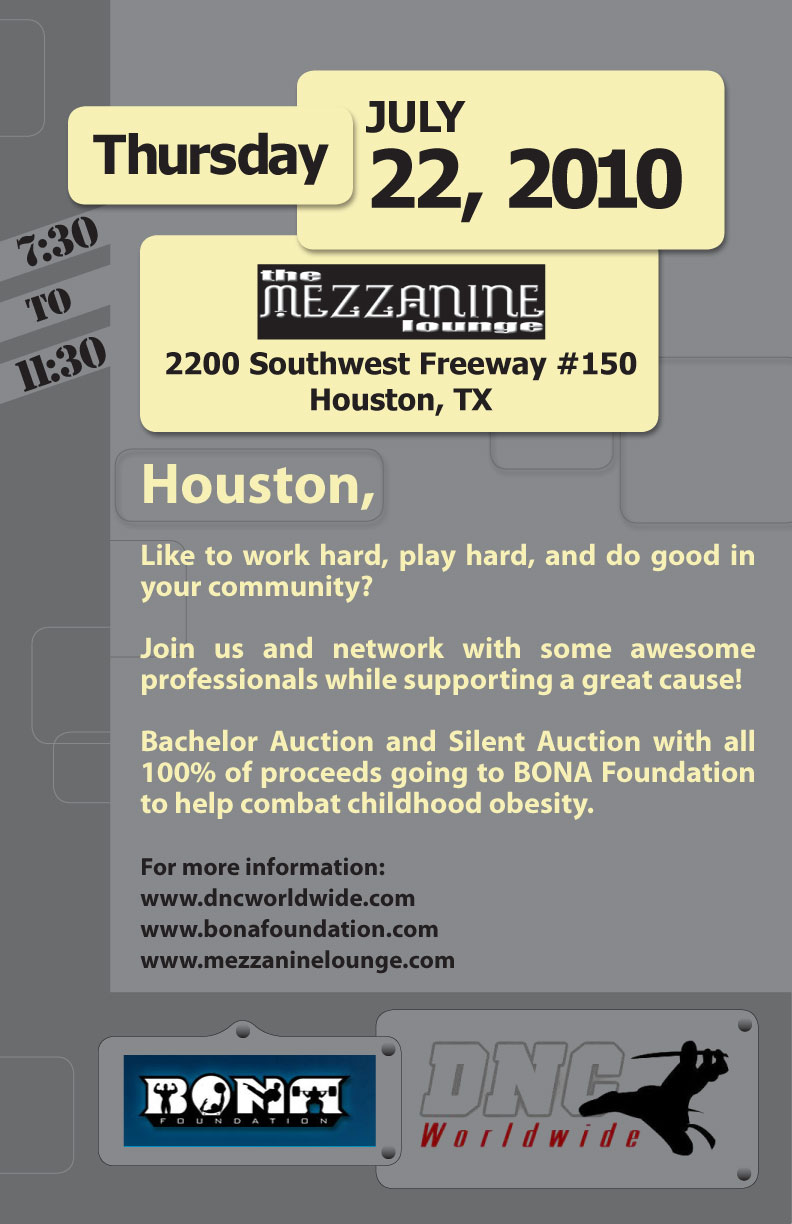 If the answer is YES to both of those questions, you should definitely join us on Thursday, July 22nd, when we will be hosting the DNC Networking Mixer and Benefit for the BONA Foundation at the Mezzanine Lounge, located just inside the loop on the corner of Highway 59 and Sheperd.